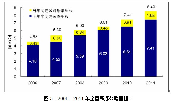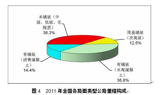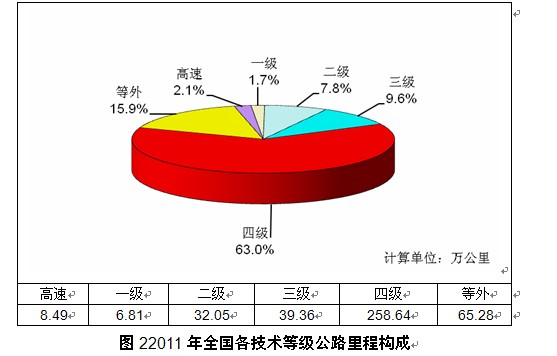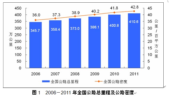 2011年底,全国公路总里程达410.64万公里,比上年末增加9.82万公里。全国公路密度为42.77公里/百平方公里,比上年末提高1.02公里/百平方公里。