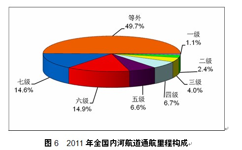 2011年底,全国内河航道通航里程12.46万公里,比上年末增加370公里。等级航道6.26万公里,占总里程的50.3%,比上年末提高0.2个百分点。其中,三级及以上航道9460公里,五级及以上航道2.60万公里,分别占总里程的7.6%和20.8%,比上年末分别提高0.1个和0.5个百分点。各等级内河航道通航里程分别为:一级航道1392公里,二级航道3021公里,三级航道5047公里,四级航道8291公里,五级航道8201公里,六级航道18506公里,七级航道18190公里。各水系内河航道通航里程分别为:长江水系64052公里,珠江水系15995公里,黄河水系3488公里,黑龙江水系8211公里,京杭运河1439公里,闽江水系1973公里,淮河水系17264公里。