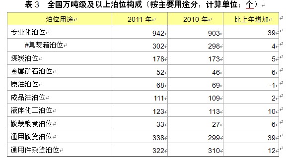 全国万吨级及以上泊位中,专业化泊位942个,通用散货泊位338个,通用件杂货泊位322个,比上年末分别增加39个、39个和12个。