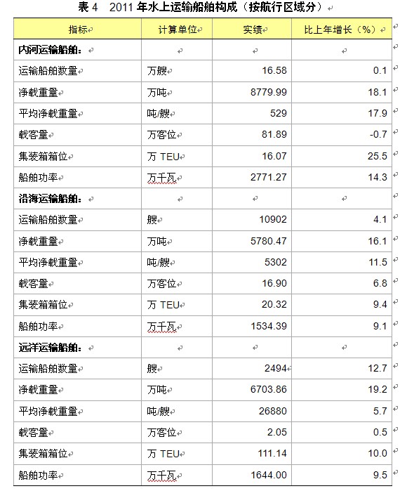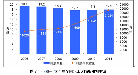 2011年底,全国拥有水上运输船舶17.92万艘,比上年末增长0.5%;净载重量21264.32万吨,增长17.9%;平均净载重量1186.35吨/艘,增长17.3%;载客量100.84万客位,增长0.5%;集装箱箱位147.52万TEU,增长11.4%;船舶功率5949.66万千瓦,增长11.6%。
