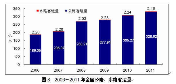 2011年,全国营业性客车完成公路客运量328.62亿人、旅客周转量16760.25亿人公里,比上年分别增长7.6%和11.6%。全国完成水路客运量2.46亿人、旅客周转量74.53亿人公里,比上年分别增长9.7%和3.1%。