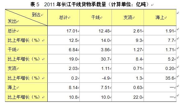 长江干线货物承载量达17.01亿吨,比上年增长12.5%。其中煤炭、金属矿石、钢铁和矿物性建筑材料占总承载量的66.8%。长江干线到干线货运量3.86亿吨,比上年增长30.7%,海上到干线运量7.51亿吨,比上年增长10.0%。