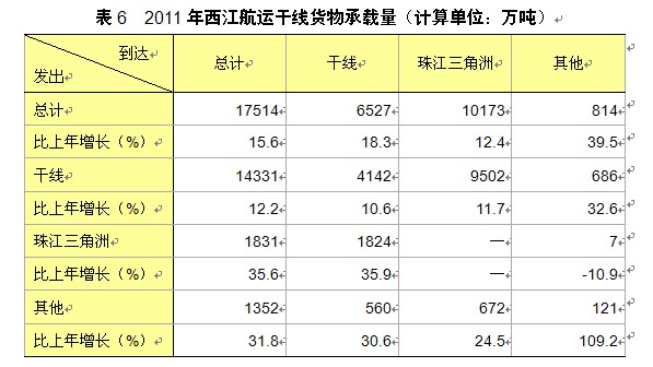 西江航运干线(思贤滘以上航段)货物承载量达1.75亿吨,比上年增长15.6%。其中矿物性建筑材料占总承载量的58.7%。西江航运干线到干线货运量4142万吨,比上年增长10.6%,干线到珠江三角洲货运量9502万吨,比上年增长11.7%。
