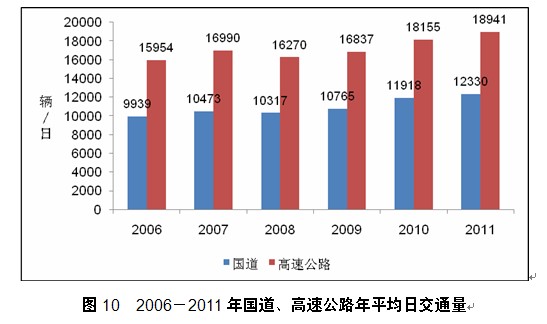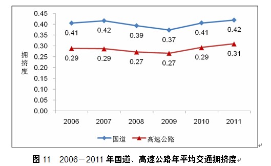 2011年,全国国道网年平均日交通量为12330辆/日(当量标准小客车,下同),比上年增长3.5%。北京、天津、上海、江苏、浙江、广东和山东的国道网年平均日交通量均超过2万辆。全国国道网年平均行驶量为208852万车?公里/日(当量标准小客车,下同),比上年增长6.8%。河北、江苏、山东、广东的国道网年平均行驶量均超过10000万车?公里/日。全国国道网年平均交通拥挤度为0.42,比上年增加0.01。北京、天津、河北、上海、浙江、广东的国道年平均拥挤度均超过0.6。其中,国家高速公路年平均日交通量为18503辆/日,平均行驶量为117736万车?公里/日,比上年分别增长1.4%和11.8%,年平均交通拥挤度为0.31,比上年增加0.01;一般国道年平均日交通量为9474辆/日,年平均行驶量为100198万车?公里/日,比上年分别增长1.9%和1.4%,年平均交通拥挤度为0.57,比上年减少0.01。
