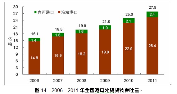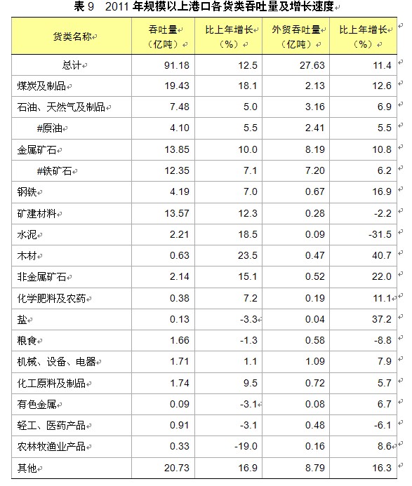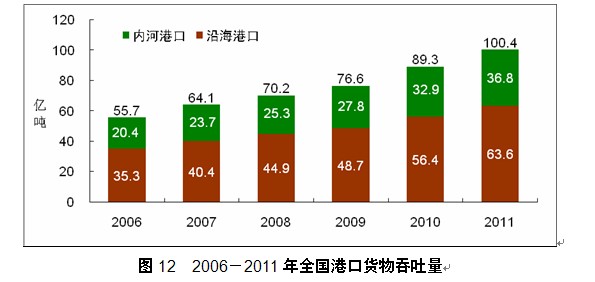 2011年,全国港口完成货物吞吐量100.41亿吨,比上年增长12.4%。其中,沿海港口完成63.60亿吨,内河港口完成36.81亿吨,比上年分别增长12.7%和12.0%。