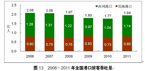 全国港口完成旅客吞吐量1.94亿人,比上年增长9.8%。其中,沿海港口完成0.80亿人,内河港口完成1.14亿人,比上年分别增长9.1%和10.3%。