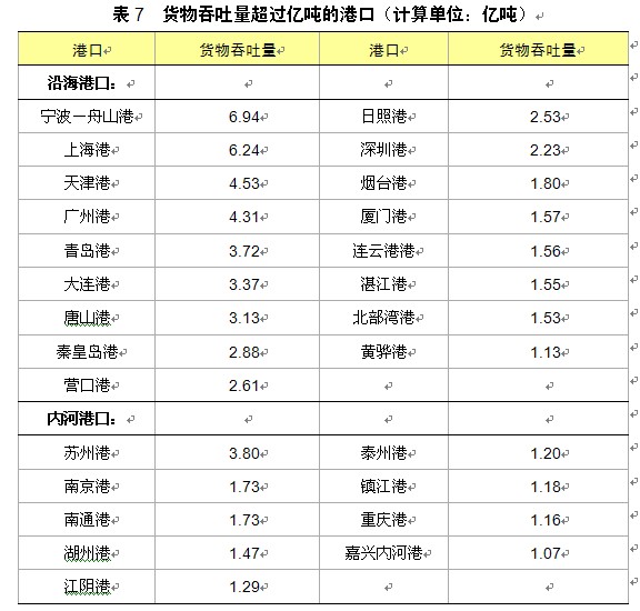货物吞吐量超过亿吨的港口由上年的22个增加到26个。其中,沿海亿吨港口17个,内河亿吨港口9个。