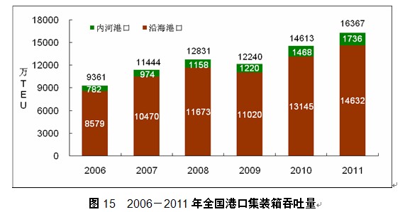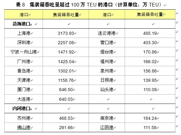 集装箱吞吐量超过100万TEU的港口由上年的18个增加到19个。其中,沿海港口15个,内河港口4个。