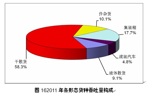 全国港口完成液体散货吞吐量9.11亿吨,比上年增长6.7%;干散货吞吐量58.55亿吨,比上年增长13.6%;件杂货吞吐量10.18亿吨,比上年增长6.6%;集装箱吞吐量(按重量计算)17.75亿吨,比上年增长15.8%;滚装汽车吞吐量(按重量计算)4.83亿吨,比上年增长10.2%。液体散货、干散货、件杂货、集装箱和滚装汽车在港口货物吞吐量中所占比重分别为9.1%、58.3%、10.1%、17.7%和4.8%。