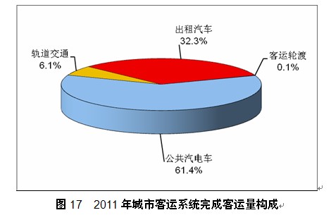2011年,城市客运系统运送旅客1165.55亿人。其中,公共汽电车完成715.79亿人,占61.4%,运营里程331.73亿公里;轨道交通完成71.34亿人,占6.1%,所占比重提高0.9个百分点,运营里程2.39亿列公里;出租汽车完成376.71亿人,占32.3%,运营里程1519.69亿公里,平均每车次载客人数1.98人/车次,空驶率30.8%;客运轮渡完成1.72亿人,占0.1%。
