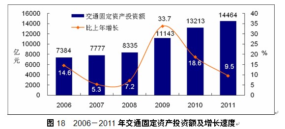 2011年,全国完成公路水路交通固定资产投资14464.21亿元,比上年增长9.5%,占全社会固定资产投资的4.7%。分地区看,西部地区全年完成交通固定资产投资5206.23亿元,所占比重为36.0%,比上年提高2个百分点;东、中部地区分别完成投资5547.67亿元、3710.32亿元,所占比重分别为38.4%和25.7%。