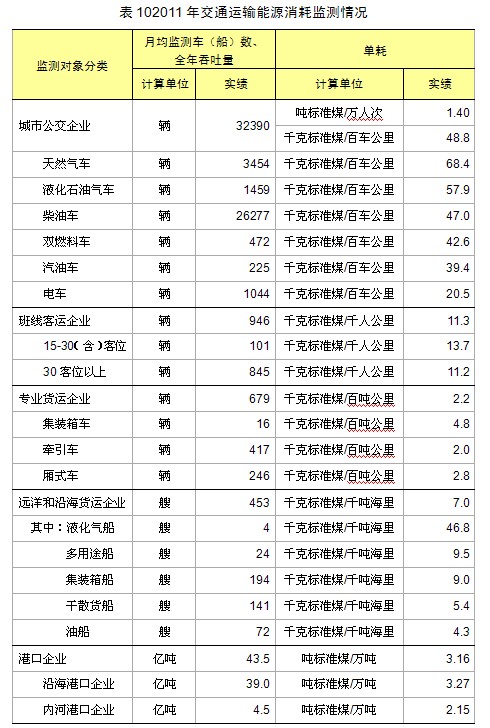 2011年起,正式执行交通运输能耗统计监测报表制度,共有监测企业86家。监测结果如下:
