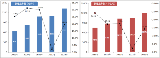 2023年邮政行业寄递业务量完成1624.8亿件,同比增长16.8%。其中,快递业务量完成1320.7亿件,同比增长19.4%。