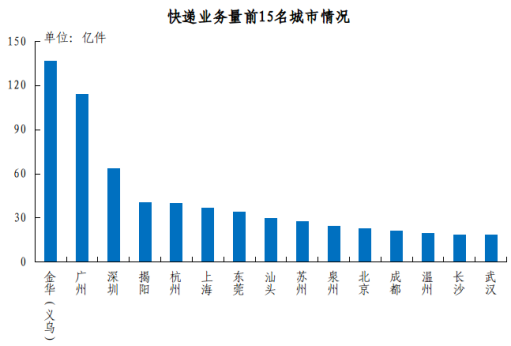 快递业务量排名前十五位的城市依次是金华(义乌)、广州、深圳、揭阳、杭州、上海、东莞、汕头、苏州、泉州、北京、成都、温州、长沙和武汉,其快递业务量合计占全部快递业务量的比重达到49.3%。