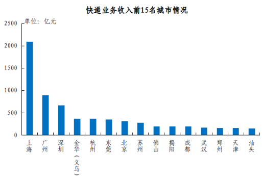 快递业务收入排名前十五位的城市依次是上海、广州、深圳、金华(义乌)、杭州、东莞、北京、苏州、佛山、揭阳、成都、武汉、郑州、天津和汕头,其快递业务收入合计占全部快递业务收入的比重达到54.4%。