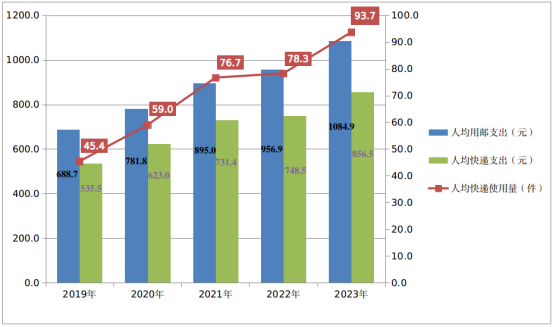 2019-2023年人均用邮支出、快递支出和快递使用量情况