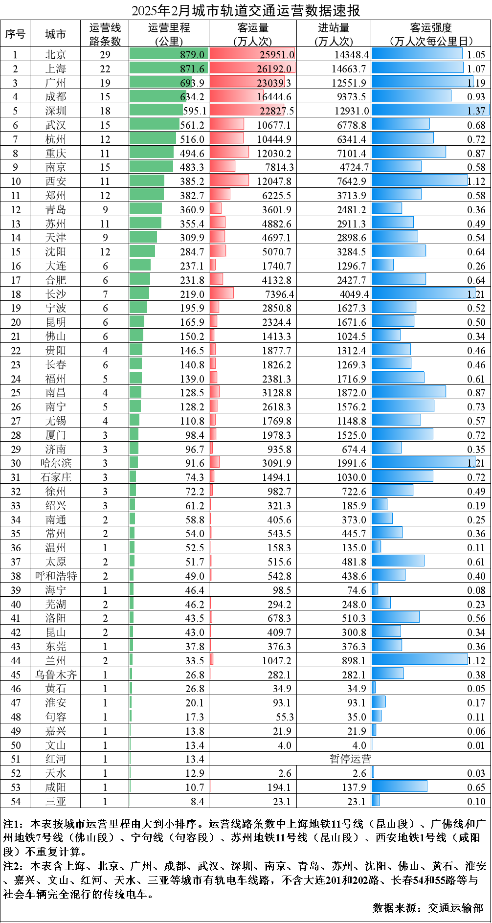 2025年2月,31个省(自治区、直辖市)和新疆生产建设兵团共有54个城市开通运营城市轨道交通线路326条,运营里程10975.8公里,实际开行列车330万列次,完成客运量24.0亿人次,进站量14.4亿人次。2月份,客运量环比减少0.8亿人次,减少3.2%,同比增加3.5亿人次,增加17.1%。2月份全国总运营里程的平均客运强度为0.782万人次每公里日,环比增加7.0%,同比增加12.8%。