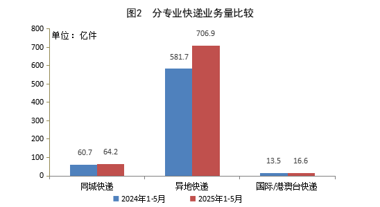 1-5月,同城快递业务量累计完成64.2亿件,同比增长5.8%;异地快递业务量累计完成706.9亿件,同比增长21.5%;国际/港澳台快递业务量累计完成16.6亿件,同比增长22.4%。