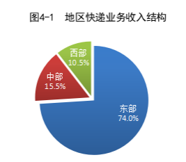 1-5月,东、中、西部地区快递业务收入比重分别为74.0%、15.5%和10.5%,快递业务量比重分别为71.5%、19.4%和9.1%。与去年同期相比,东部地区快递业务收入比重下降0.8个百分点,快递业务量比重下降1.5个百分点;中部地区快递业务收入比重上升0.5个百分点,快递业务量比重上升0.9个百分点;西部地区快递业务收入比重上升0.3个百分点,快递业务量比重上升0.6个百分点。