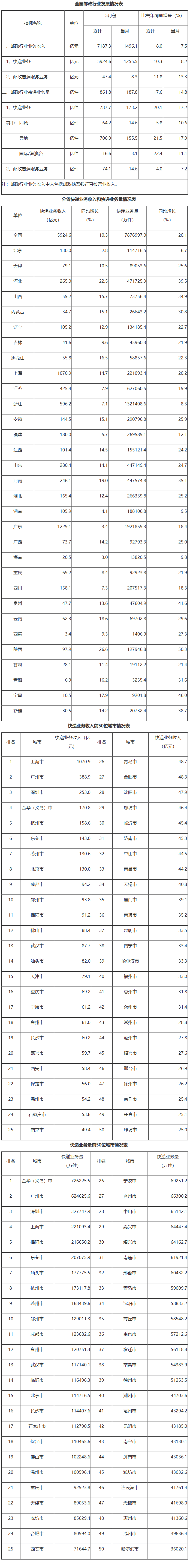5月份,邮政行业寄递业务量完成187.8亿件,同比增长14.8%。其中,快递业务量完成173.2亿件,同比增长17.2%。