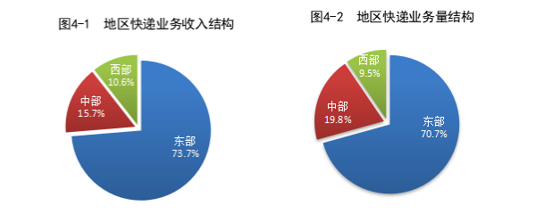 1-11月,东、中、西部地区快递业务收入比重分别为73.7%、15.7%和10.6%,快递业务量比重分别为70.7%、19.8%和9.5%。与去年同期相比,东部地区快递业务收入比重下降1.2个百分点,快递业务量比重下降1.7个百分点;中部地区快递业务收入比重上升0.8个百分点,快递业务量比重上升1.1个百分点;西部地区快递业务收入比重上升0.4个百分点,快递业务量比重上升0.6个百分点。