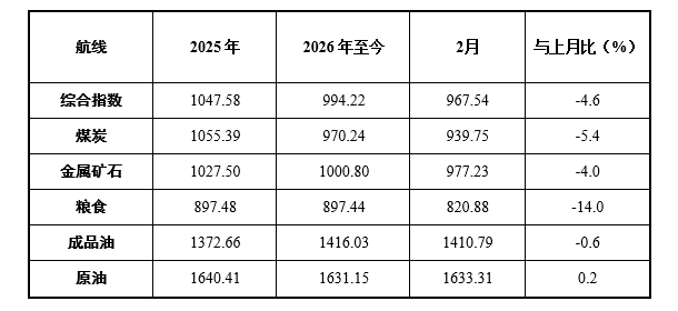 2026年2月中国沿海(散货)运价指数表