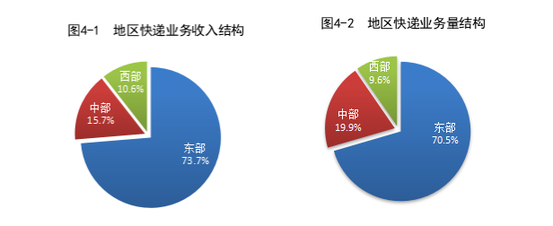 2025年,东、中、西部地区快递业务收入比重分别为73.7%、15.7%和10.6%,快递业务量比重分别为70.5%、19.9%和9.6%。与去年同期相比,东部地区快递业务收入比重下降1.1个百分点,快递业务量比重下降1.9个百分点;中部地区快递业务收入比重上升0.8个百分点,快递业务量比重上升1.2个百分点;西部地区快递业务收入比重上升0.3个百分点,快递业务量比重上升0.7个百分点。