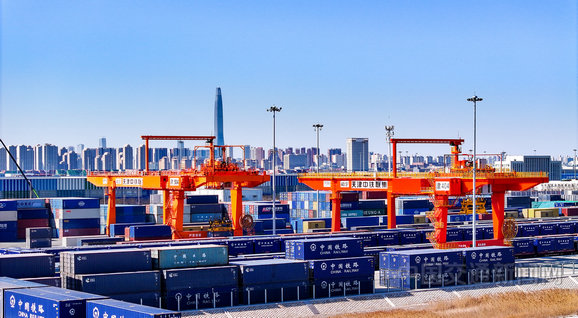 图为天津集装箱中心站内,一列发往中亚国家的班列正在进行装箱作业。