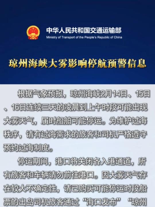 琼州海峡大雾影响停航预警信息 #琼州海峡