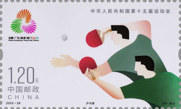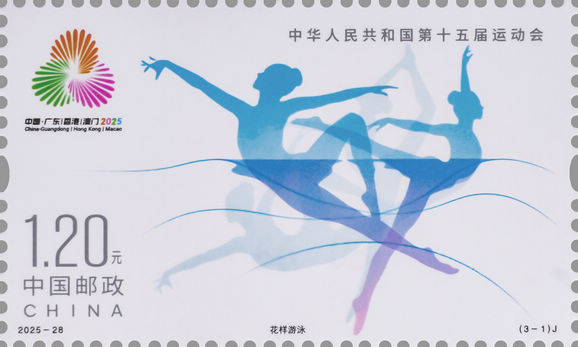 中华人民共和国第十五届运动会于11月9日至21日在广东、香港、澳门举行。全国运动会首次由粤港澳三地联合举办。纪念邮票1套3枚,邮票图案名称为花样游泳、击剑、乒乓球,全套面值3.6元。第1枚邮票表现内容为花样游泳,以跃动的剪影表现运动员在水中的灵动瞬间;第2枚邮票表现内容为击剑,以飞动的线条表现运动员迅猛矫健的身姿;第3枚邮票表现内容为乒乓球,以鲜明简练的色块展现出运动员发球瞬间的气势和张力。