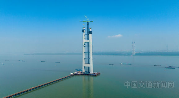 张靖皋长江大桥南航道桥南主塔是大桥4座主塔中唯一一座江中主塔,塔高350米,是世界最高悬索桥主塔,每个塔柱由30个节段拼装而成。此次吊装的上游塔柱T26节段分为两个块体,总重达508吨,分两次吊装完成。