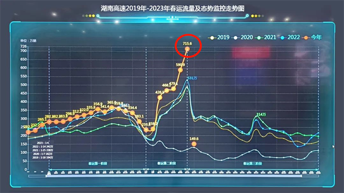 湖南省高速公路路网运行监测指挥中心数据显示,1月27日,大年初六,全省高速公路路网流量达715.55万辆,较去年同比增加34.84%,是平日流量的3.34倍,日均流量创历史新高,重点收费站、重点枢纽车流饱和。全省高速公路省界出入口流量达483.43万辆,同比增长近3倍。路网流量高位运行,全路网呈现满负荷、多热点,潮汐性特点。