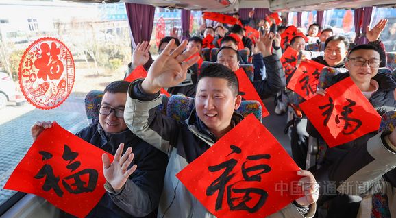 图为南京交通运输部门为集中返乡的建设者提供包车服务,并赠送春节礼包。
