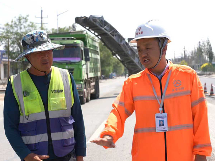 陈鹏(右)扎根工地建设一线。 吴忠市公路管理段 供图